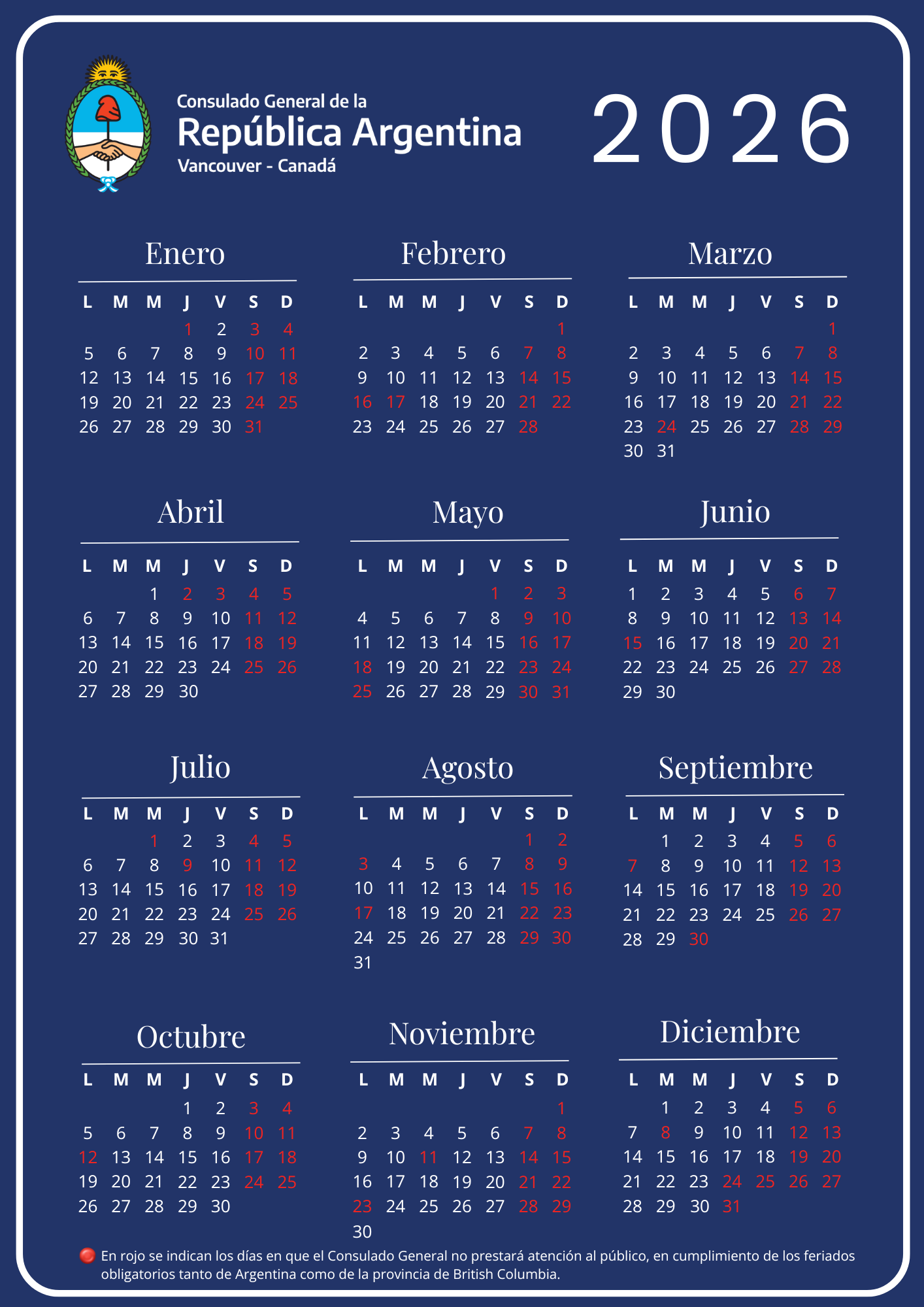 En el Calendario 2026 podrá consultar los días en que el Consulado General de la República Argentina en Vancouver no prestará atención al público, en cumplimiento de los feriados obligatorios tanto de Argentina como de la provincia de British Columbia.