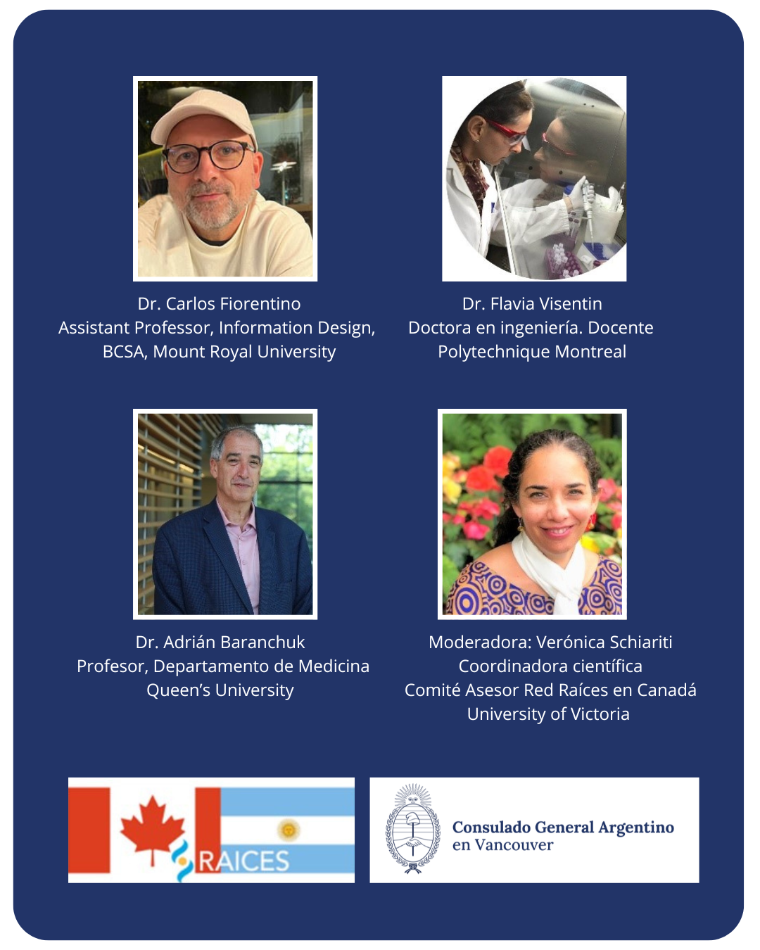 La Red RAÍCES en Canadá y el Consulado General de la República Argentina en Vancouver te invitan a un encuentro en línea para conocer los proyectos y contribuciones de destacados científicos argentinos que desarrollan su labor en universidades de Canadá.